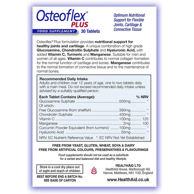 Osteoflex Plus provides nutritional support for healthy joints and cartilage. It is a unique combination of high-grade Glucosamine, Chondroitin Sulphate and Hyaluronic Acid, with added Vitamin C, Turmeric and Manganese to help maintain supple, flexible joints, strong cartilage and a healthy skeleton
