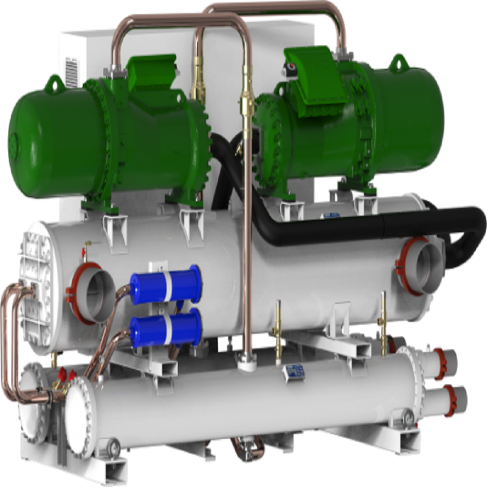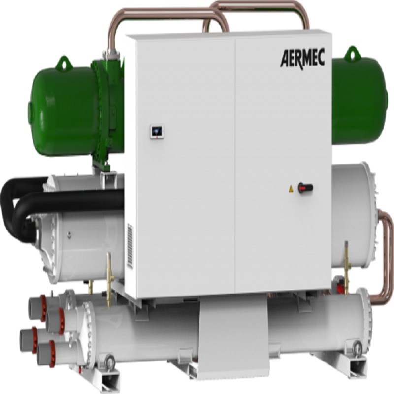 WFN is a dual-circuit or triple-circuit indoor unit for producing chilled or heated water chiller charged with R134a gas and twin screw compressors. Adapts to various load conditions thanks to precise temperature control. Produces chilled water up to 16 °C (processed water, evaporator side) and can also be used with a heat pump with a processed water temperature (on the condenser) of up to 55 °C. Both heat exchangers (source side and system side) are of the shell & tube type. The electronic expansion valve is a standard on all the sizes and ensures excellent flow regulation and accurate temperature control, even with partial loads. It is available in 2 versions: Standard and High efficiency.