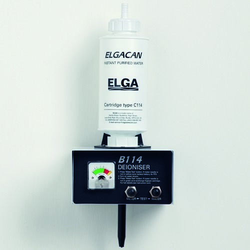 The B114 is a compact, wall-mounted unit ideal for users who require low volumes of ultra-pure water. It features a 9V battery operated colour coded conductivity meter operated by depressing the 'water test' switch allowing instant monitoring of the treated water quality. When exhaustion of the ion exchange resins is indicated, cartridge replacement is a simple, rapid operation.