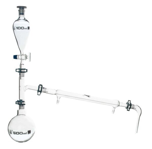 Round-bottom Boiling Flask 500 mlStill headLiebig CondenserReceiver adapterSeparating funnel with stopper.
