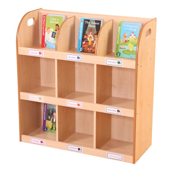 Specifically designed to store and display popular book sizes (up to H275 x D275) - perfect for reading scheme books. Most children learn to read at school with reading scheme books. Individual compartments means books can be stored/displayed in colour bands. There are up to 18 colour bands used in schools covering from reception class to year 6 (age 11) - colours range from pink/lilac through to lime. Keep books stored according to reading ability. Portable - Easy to pick up and move with hand holes. Flexibility - shelves are great for storage. However books can also be turned face on to make them more likely to catch the eye. Supplied flat packed for simple assembly. , Raw Materials: Manufactured from strong 15mm mdf with rounded and profiled edges. Tested to meet relevant safety standards., Dimension : 915 x 885 x 350 , Age range : Ages 2+