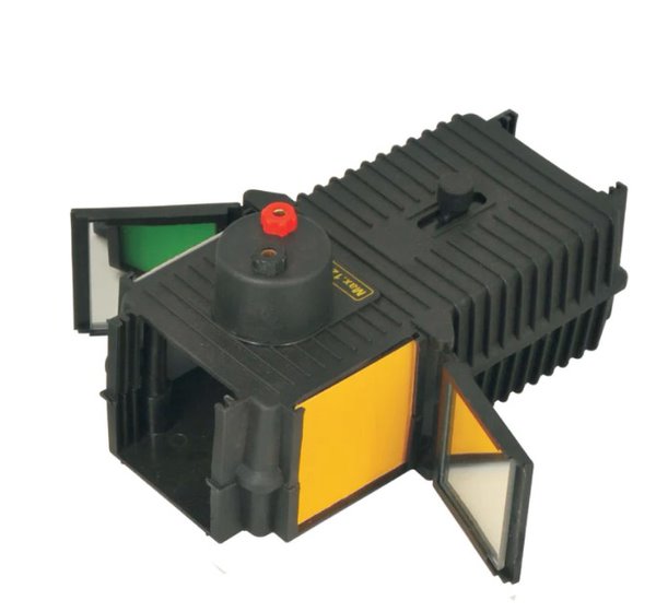 This kit is very useful for reflection, refraction and colour mixing experiments. The Mirrored Raybox (code: EDU528) consists of a light source (12V, 24W lamp) producing a convergent, divergent or parallel beam. On one end there is an adjustable cylindrical convex lens (for parallel beam) and a triple aperture system for colour mixing experiments at the other end. (Lateral aperture is provided with adjustable hinged mirror). All apertures in the box are provided with vertical channels to hold slit-plates and colour filters